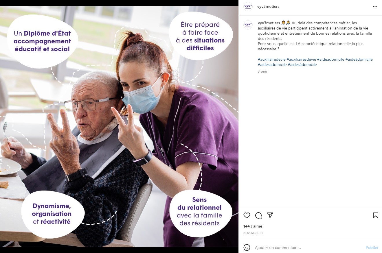 Les contenus sont alimentés régulièrement par des photos et vidéos existantes de structures VYV3 mais également par des posts de professionnels exerçant dans nos établissements, avec pour finalité de donner un ton ancré dans le réel, montrant nos valeurs, la fierté de ces collaborateurs, leur parcours métier, les équipes…